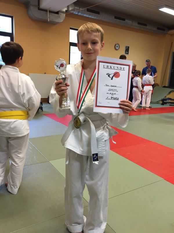 A proud Tom with his first Karate Trophy/Medal and Certificate